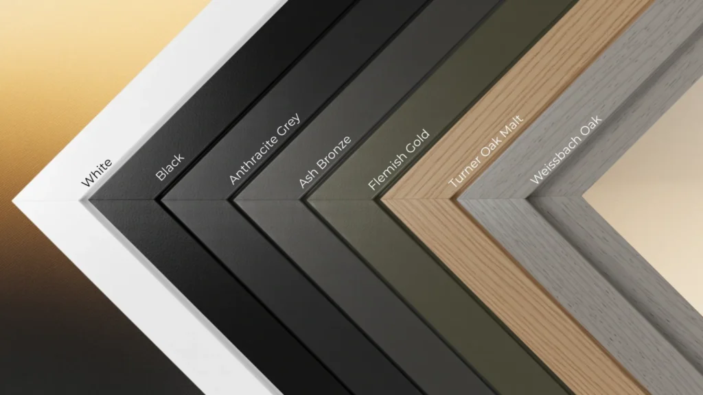 The Alpine line offers classic white-outside/white-inside or black-outside/white-inside finishes, while the Lumina line adds a range of modern tones—Anthracite Grey, Flemish Gold, and Ash Bronze, plus optional woodgrain interior finishes.
